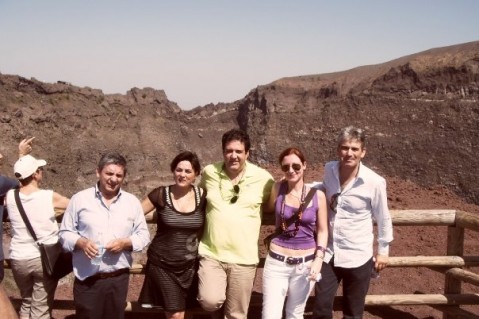 Siamo sul cratere nato dall'eruzione del 1944: 300 metri di profondità, 600 di diametro. Da sinistra: Michele Romano, Emanuela Russo (Cantine Astroni), Luciano Pignataro, Francesca Di Criscio (presidente della Strada del Vino dei Campi Flegrei, Cantina Quartum) e Pasquale Brillante, delegato Ais Comuni Vesuviani