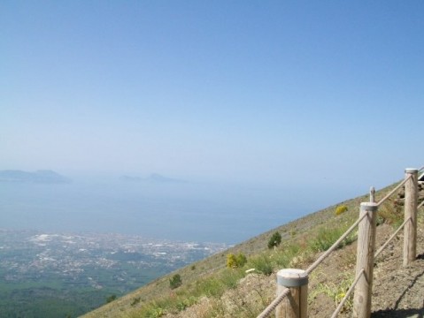La giornata è torrida e afosa, mentre il transfer messo a disposizione per il servizio navetta per conto dell’Ente Parco Nazionale del Vesuvio, Provincia di Napoli e Regione Campania, si inerpica dal versante di Trecase percorrendo la Via Matrone lungo il fitto bosco di pini secolari. Salendo da questo lato, la vista del golfo con Capri ha una magia particolare, la foschia dà una sensazione di irreale.