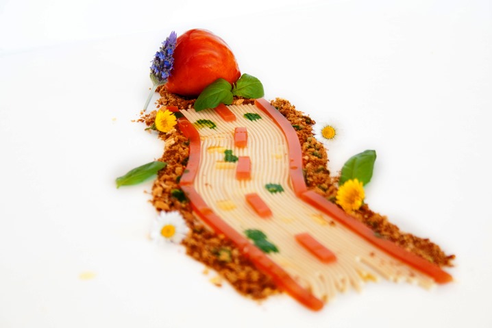 Versare quindi il composto ottenuto in un telo di cotone o lino, e strizzare bene in modo da estrarne tutto il liquido. Aggiustare di sale e versare in una casseruola 200g di acqua di pomodoro, sciogliendo al suo interno 2g di agar-agar. Mescolare bene e accendere il fuoco. Portare ad ebollizione e attendere 1 minuto dall’ebollizione. Spegnere e versare il liquido in un piatto piano. Fare raffreddare fino a gelificazione completa.