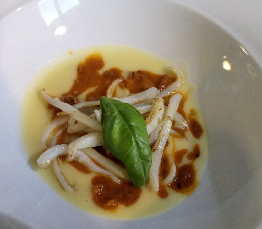 Zuppetta di seppia al pomodoro e la sua tagliatella, su vellutata di fagioli di Controne. Piatto piacevole, fresco, intrigante e bene elaborato, segnato da un tocco di classe.