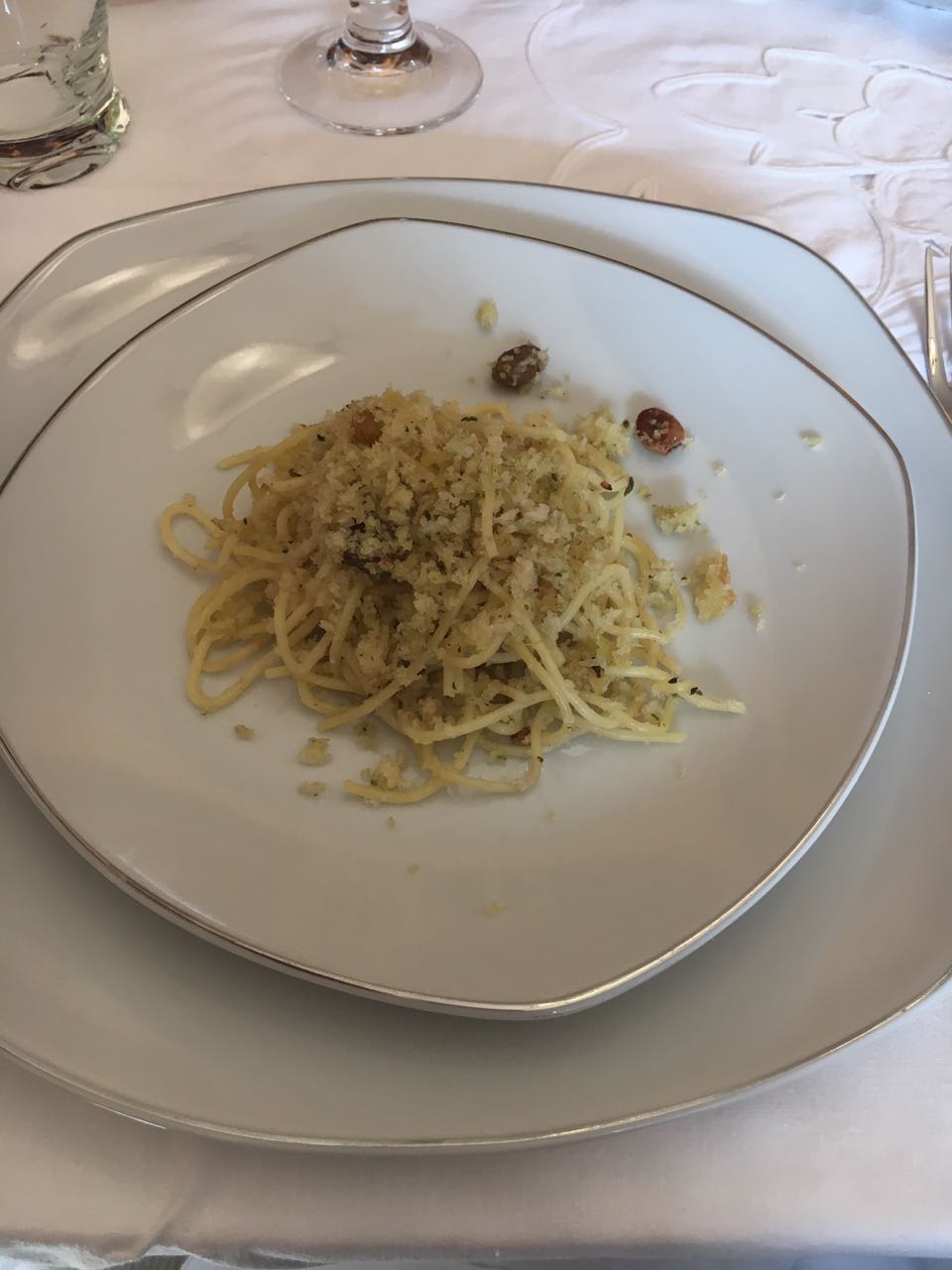 Il filo della semplicità prosegue con gli spaghetti con la mollica del pane cotto a legna e fatto in casa, piatto povero simbolo di generosità e accoglienza.