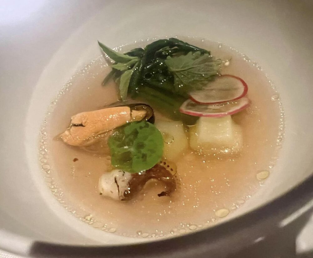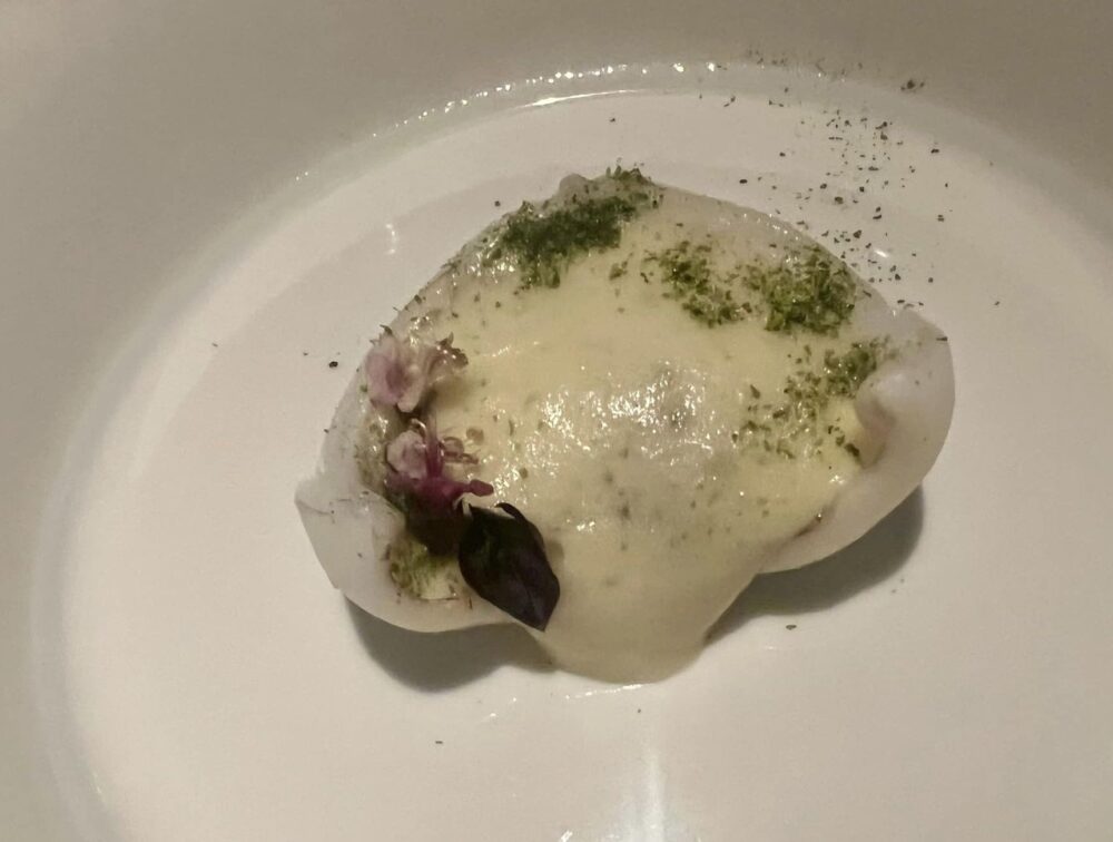 Gli apetizer, fatti di tanti piccoli bocconi, eleganti, concentrati, sono pensati per accompagnare un calice di bollicine. Asparagi bianchi, limone amalfitano e gambero rosso di Mazara, convincent,e con un lavoro notevole sulla parte vegetale, vera protagonista di questo piatto e da una materia prima nobile come il gambero rosso di Mazara.