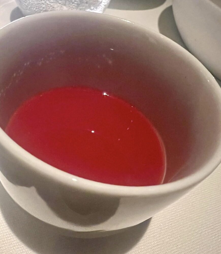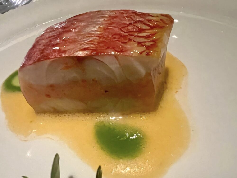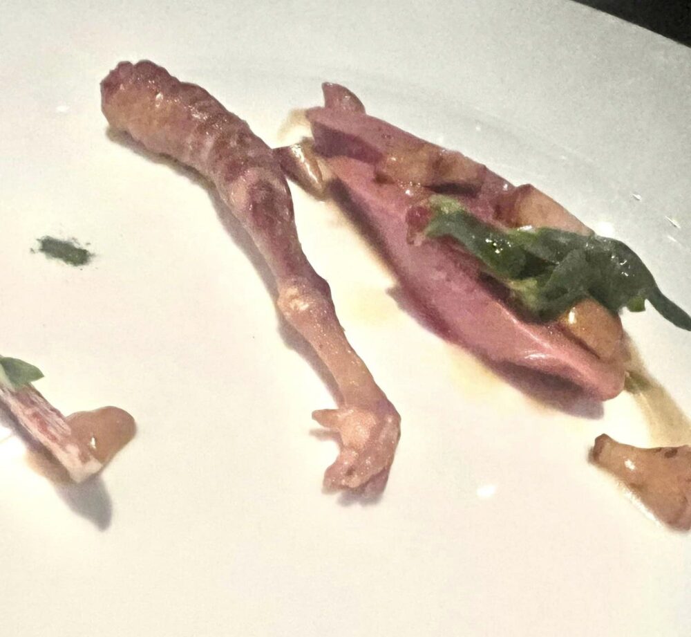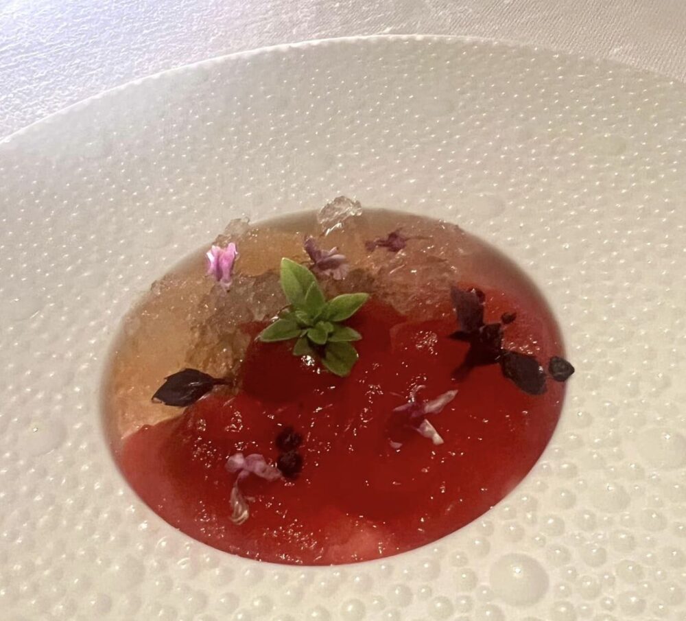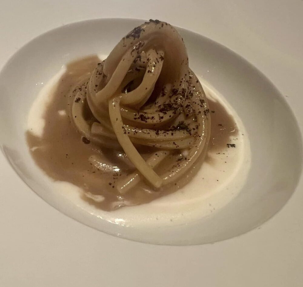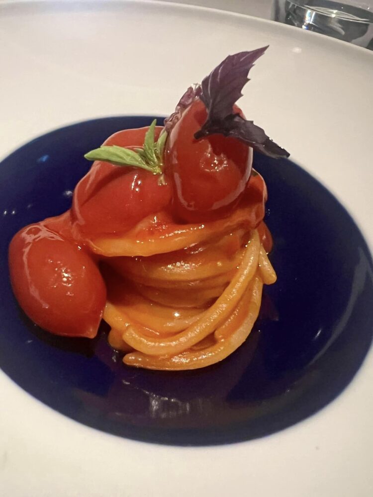 La calamarata cotta in acqua di pomodoro con acciughe marinate al Martini è il piatto del viaggio. I cuochi italiani da quando si sono affrancati da foie gras e dall’eterofilia a tutti i costi hanno una marcia in più, questa versione della pasta al pomodoro, arricchita, ne è il chiaro esempio. Golosa, moderna, acidità, profondità aromatica e intensità gustativa, lo rendono un piatto assolutamente delizioso.