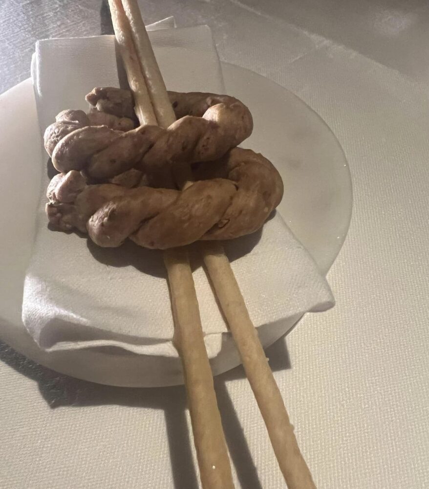 In quetsi percorsi Salvatore riesce ad estrarre il sapore dei prodotti, la cucina si basa sull’olio d’oliva ed è molto attenta alla leggerezza e al dosaggio del sale e dei grassi: ci si alza da tavola senza appesantimento. Nota di merito, sempre, decisamente italiana, l’attenzione alla panificazione comprensiva di grissini e taralli.