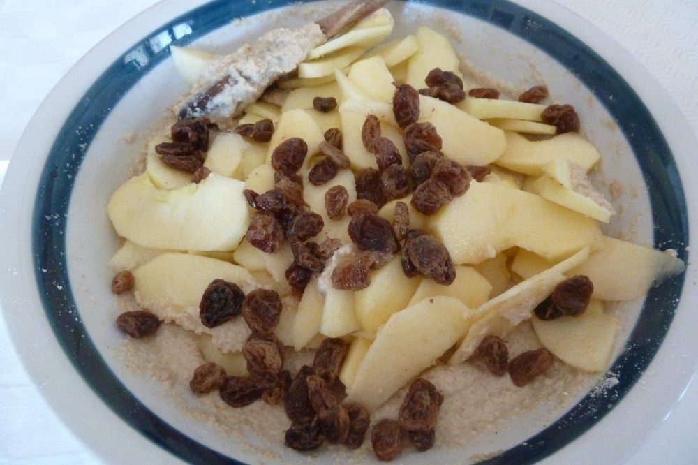 Tagliare a fettine sottili altre due mele, spolverizzarle di zucchero di canna e spruzzarle con un po’ di succo di limone, amalgamare il tutto nella ciotola della farina aggiungendo l’uvetta strizzata e versare il composto in una teglia di ventidue centimetri di diametro precedentemente unta con poco olio e spolverizzata di pan grattato, qualora il composto dovesse risultare poco fluido, aggiungere un po’ d’acqua.