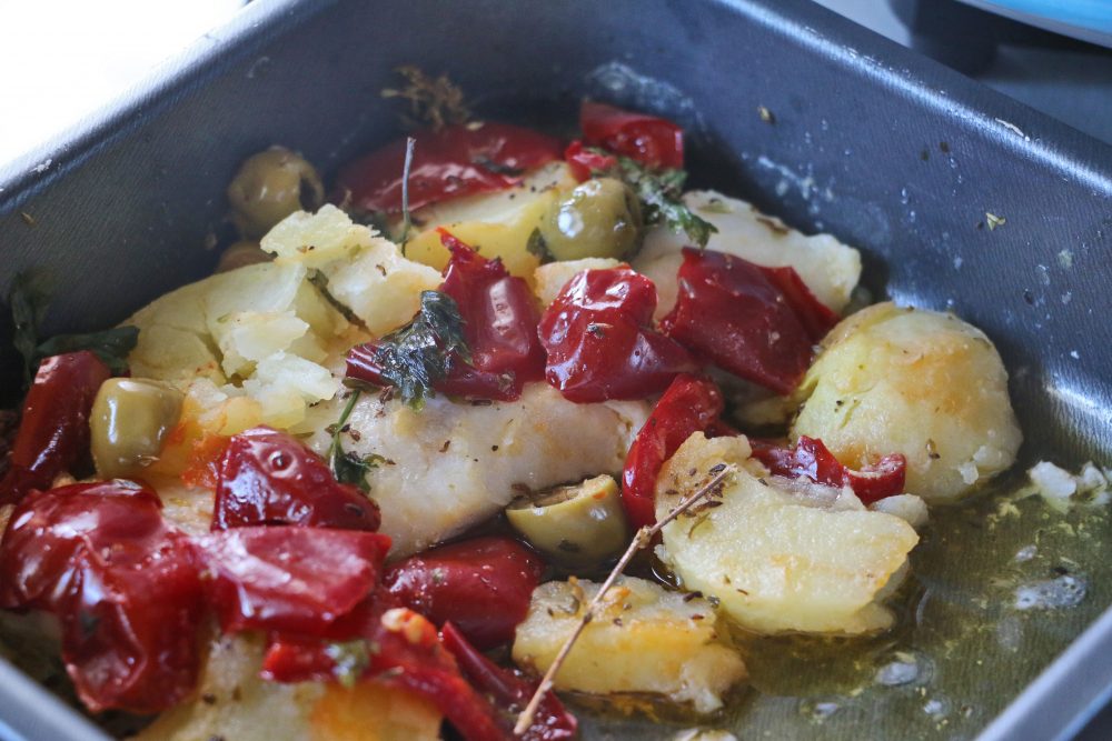 Disporre in una tortiera, meglio se di alluminio i filetti sgocciolati. Contornarli con le patate precedentemente tagliate a pezzi grossi. Aggiungervi i peperoni sottaceto, privati dei semi, gli spicchi d’aglio interi, le olive, il prezzemolo tritato e cospargere il tutto di olio. Infornare a 180 gradi per circa 40 minuti o fino a quando le patate siano cotte. Se è il caso aggiungere un pizzico di sale solo sulle patate. Servire il piatto caldissimo.