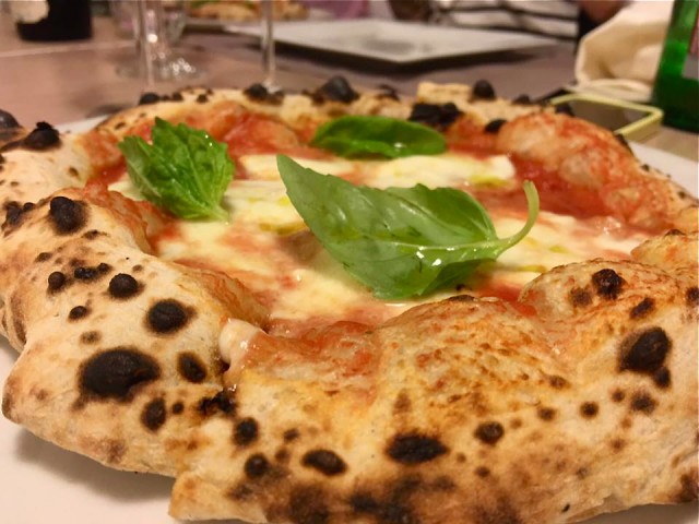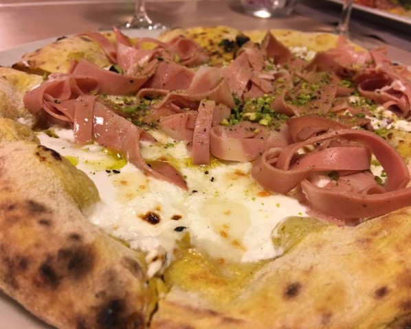 Tre pizze con impasto alternativo che ha curato Davide Palladinelli, il responsabile dell’Accademia: germe di grano condita con pesto di rucola, fior di latte, pomodoro del piennolo, lonzarda di suino razza casertana; curcuma con fior di latte, ricotta di fuscella, mortadella e pistacchio di Bronte; multicerale con datterino giallo, fior di latte di Agerola, caso conciato bagnolese.