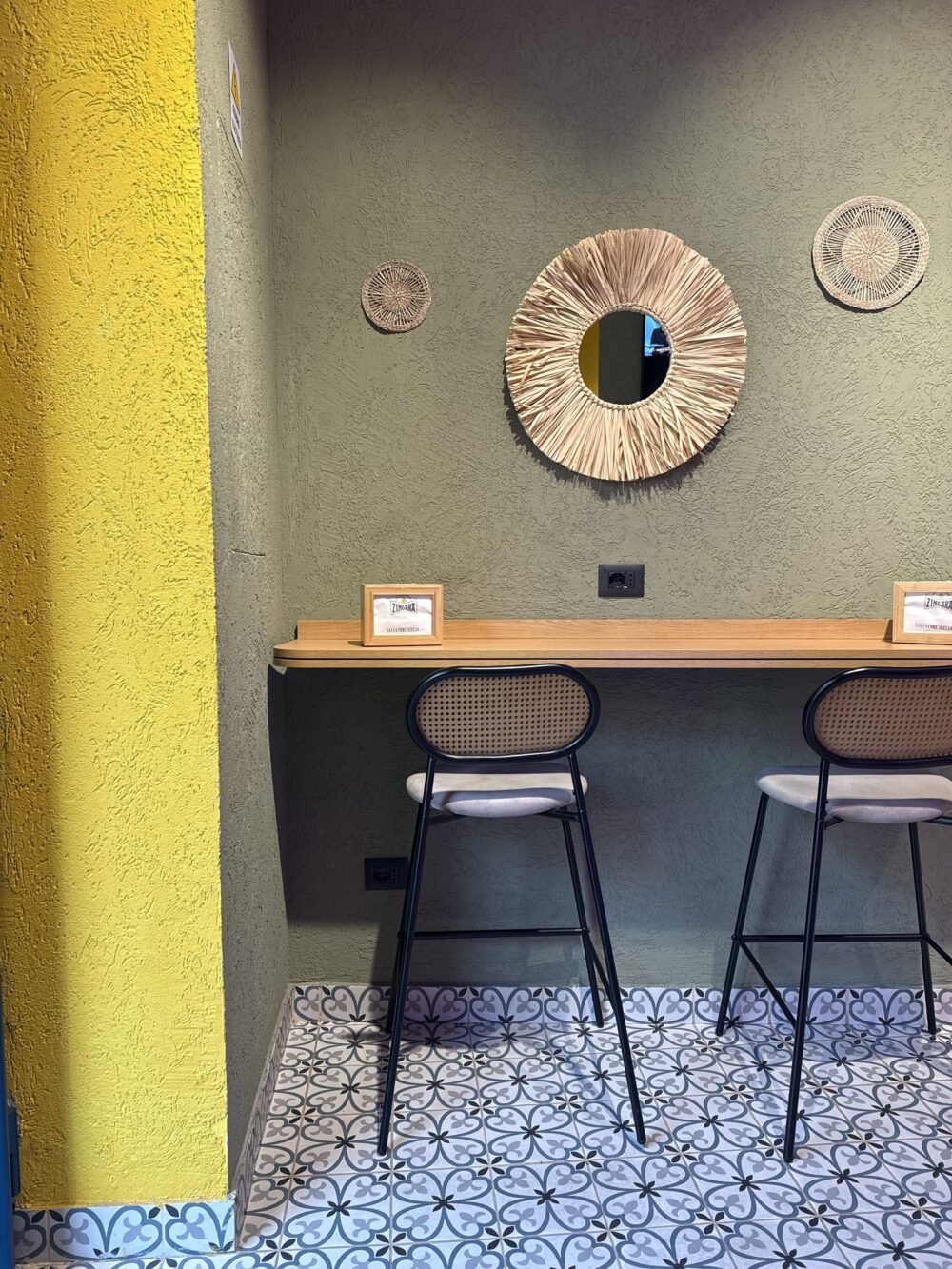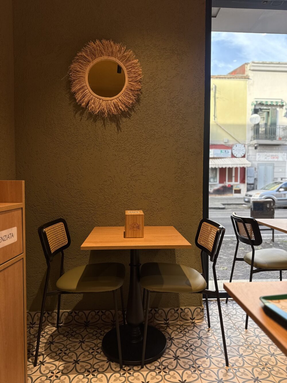 Il punto vendita di Pomigliano d’Arco, in via Roma 268, sintetizza bene questa impostazione. Il locale è luminoso, ordinato, costruito su cromie calde e materiali naturali; un’estetica contemporanea che rimanda alla leggerezza mediterranea senza trasformarsi in scenografia. L’ambiente è pensato per essere funzionale, accogliente, leggibile: un linguaggio visivo che parla la lingua della città e non quella della cartolina turistica.