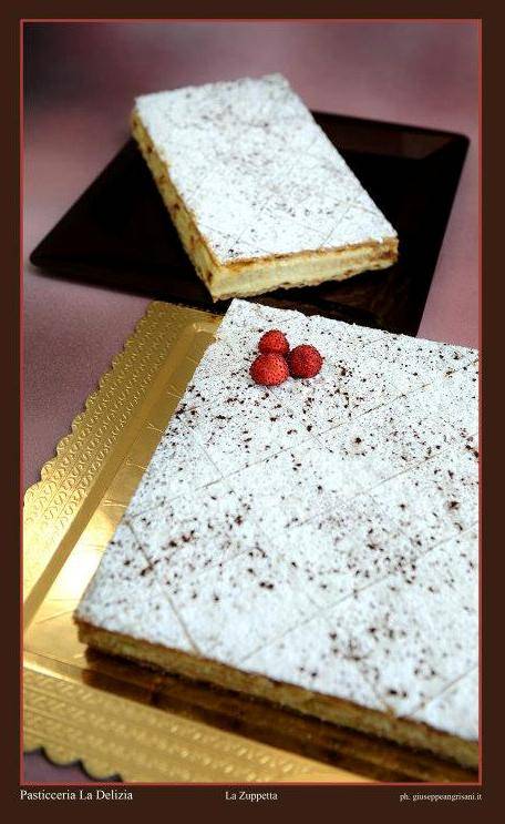 Prendete due sfoglie e stendete la crema su entrambe. Su una sfoglia stendete il pan di Spagna tagliato a lastrine e bagnato con una miscela di rhum e strega, coprite con l’altra sfoglia. Infine, spolverate con zucchero a velo e servite.
