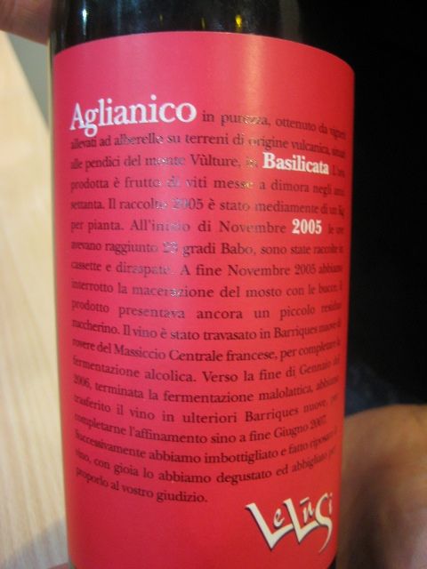 Tocca al Lelùsi, Aglianico del Vulture DOC, annata 2005, grado alcolico 13,5%.