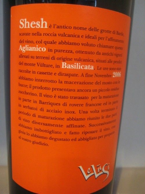 Mi incuriosiva l’assaggio dei vini e quindi procediamo con il primo, l’aglianico del Vulture DOC, denominato SHESH, dal nome delle grotte di tufo in cui sono realizzate le cantine di Barile, dell’annata 2009, grado alcolico 13%.
