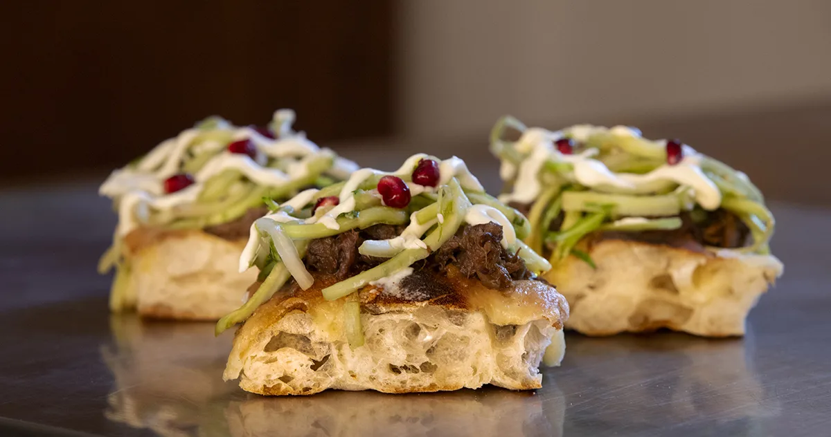 Questa ricetta prende ispirazione da un viaggio in Piemonte, precisamente ad Asti, dove Francesca assaggia uno stracotto di guancia di cavallo con verdure arrosto; da qui il desiderio di riadattare la preparazione in versione Agropontina, attraverso l’utilizzo di carne di bufalo, delle puntarelle e della rapa bianca di Sabaudia.