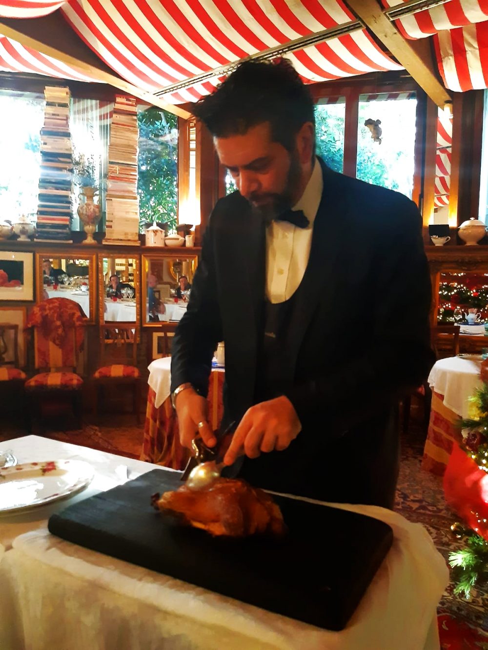 Piatto inamovibile nel ristorante, viene presentato al tavolo con tutto l’orpello della sua spartizione e condimento. Un rito che prepara alla battaglia finale. Quello della porzione per una persona: mezza anatra. Rimandi dolciastri, pelle finemente croccante, animale puro, gustoso, selvaggio. Si potrebbe continuare all’infinito, con gli Agnolini, le uova di faraona, i Bigoli al torchio. Quello che rimane è un lungo sorriso, che riconcilia col mondo e con la storia della cucina del Belpaese, sempre dopo aver perso gli ultimi freni inibitori sullo Zabaione caldo fatto al momento, nel paiolo di rame, e i vari dolcetti di accompagnamento: sbrisolona, meringa, brutti/buoni e così via, verso l’infinito.