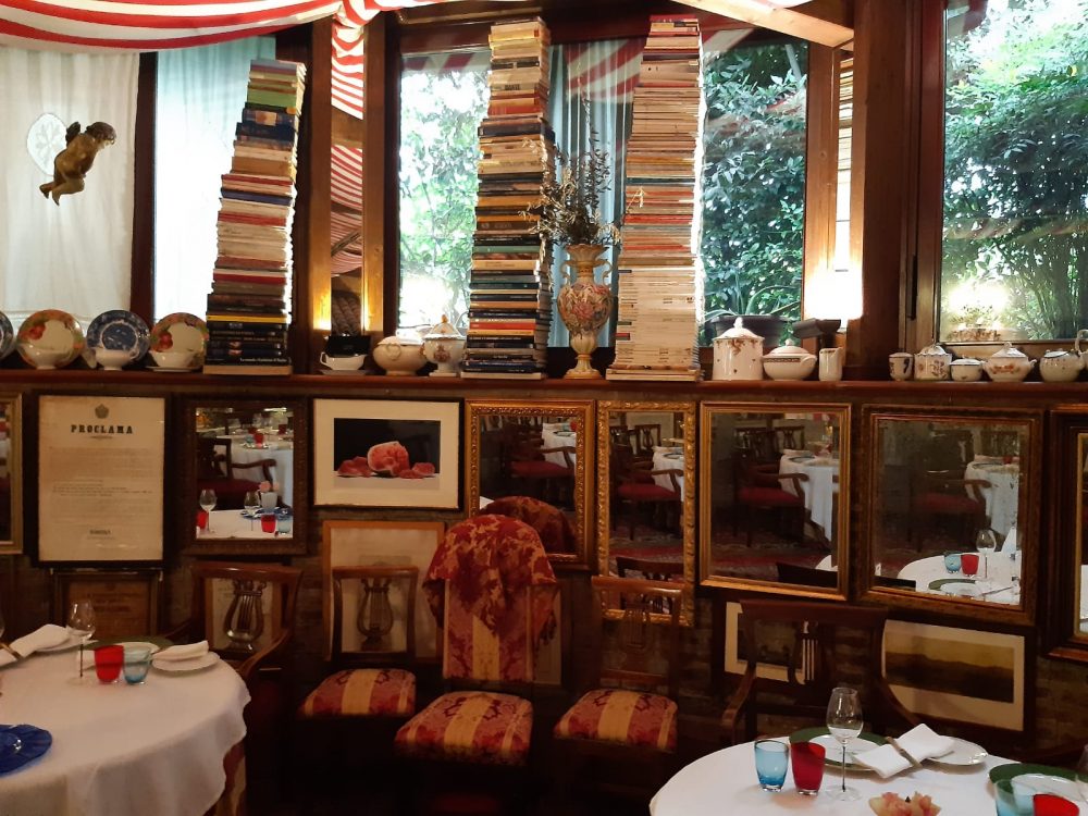 Stella Michelin e tempio di protezione della cucina mantovana, l’Ambasciata lustra gli occhi con il suo gioco di specchi infiniti, il velarium sul soffitto, le pile di libri, di tomi della cucina internazionale, drappeggi rossi e il soffice tepore dei tappeti. Colorato e caloroso, con echi della Belle Epoque e uno spirito ricco, mai borghese.