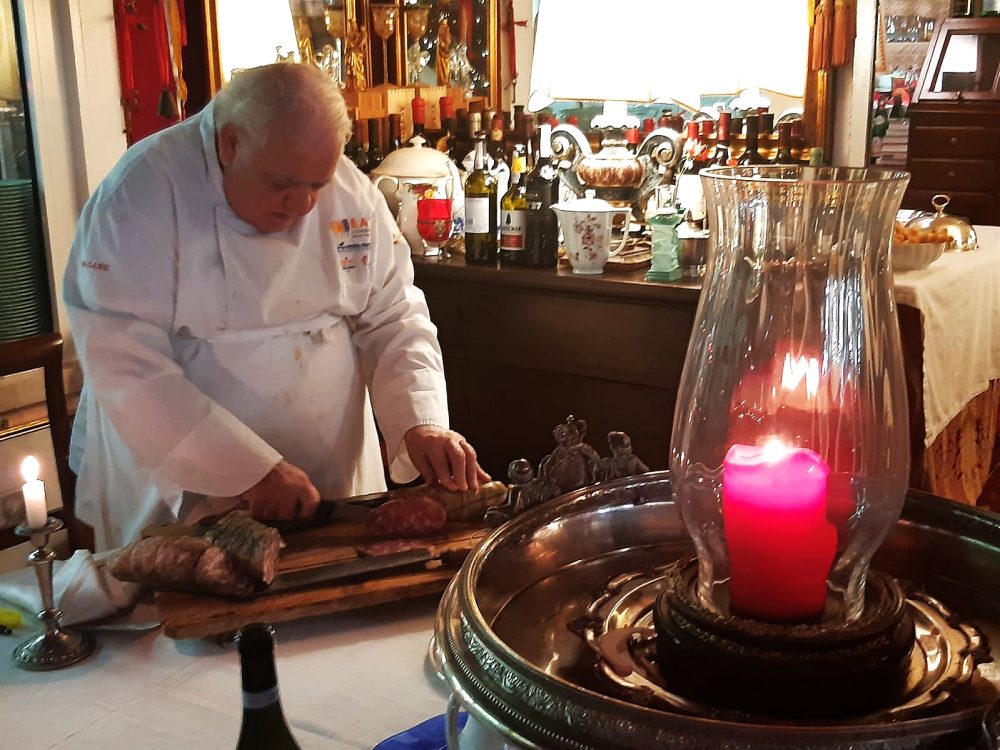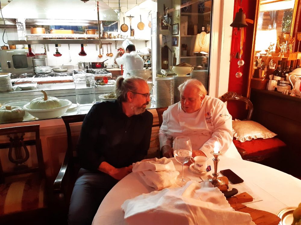 Sarebbe una licenza poetica troppo banale parlare di atti di fede e sensazioni autoreferenziali, pittoriche. L’Ambasciata colpisce per la sua idea, scolpita nei solchi delle rughe di Tamani, di cucina. Opulenza, abbondanza, sfarzo. Non esiste assaggio, gioco meramente cerebrale. Si lavora con lentezza, voglia, fame animalesca. Lo si capisce già dall’aperitivo, accompagnato da un vassoio di ciccioli e dai salami locali tagliati da Romano stesso: vere bistecche di lussurioso abbandono. Tamani, irriverente, ci racconta del passato, dello star system attuale in fatto di chef, ridicolizzandolo, e bacchetta uno sventurato cliente che osa “prendere come entrée per la prima volta in cinquantanni, una insalatina”. Si rifarà più tardi.