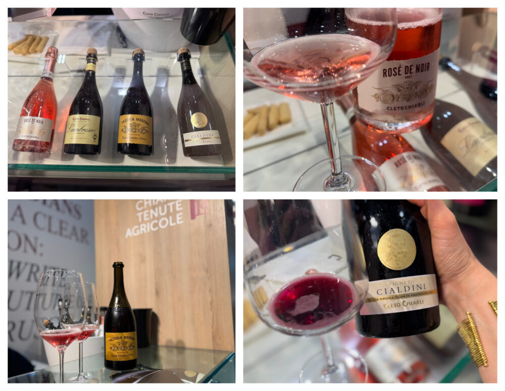 A Castelvetro di Modena, con Cleto Chiarli Tenute Agricole, il Lambrusco trova una dimensione storica consolidata. L’incontro con Sara Brighetti, responsabile dell’accoglienza, restituisce il senso di un sistema aziendale strutturato. Lambrusco del Fondatore, rifermentato in bottiglia, rappresenta la continuità con il metodo tradizionale; Vigneto Cialdini, Grasparossa di Castelvetro DOC, è il cru identitario dell’azienda; Vecchia Modena Premium mantiene una linea elegante e riconoscibile, mentre il Rosé de Noir Brut introduce una lettura più contemporanea. Qui la tradizione diventa struttura evolutiva.