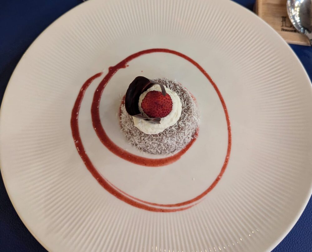 Il dolce: pudin di cioccolato e cocco con chantilly di mascarpone e fragoline. Proposte, dove alcune saranno elaborate da Pasquale Cavallo ed inserite nel menù della prossima stagione estiva.