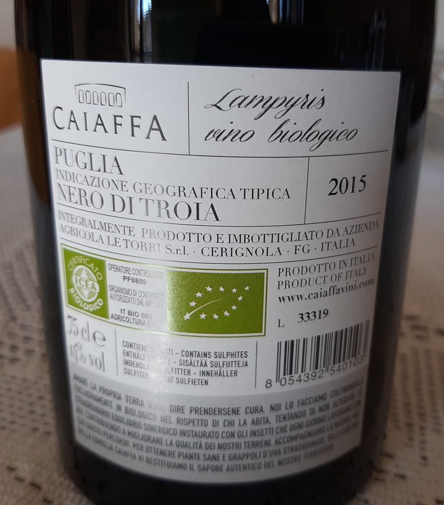 Dopo avere assaggiato pochi giorni fa il Vibrans, ecco il Lampyris Nero di Troia Vino Biologico Puglia Igt 2015 dell’Azienda Caiaffa di Cerignola. Diciamo che questa è la migliore etichetta aziendale, per il contenuto, il tempo di maturazione del vino più elevato e per il costo della bottiglia più alto.