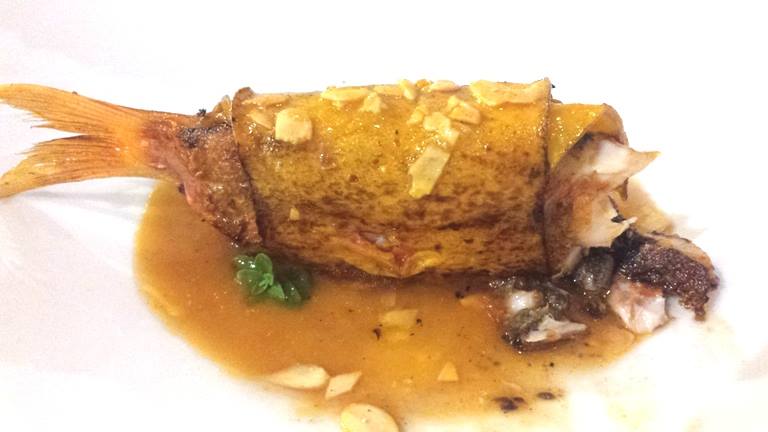 Completa il momento che precede il primo piatto ‘La Triglia e La Zucca’, triglia sfilettata farcita con capperi, acciughe, olive, pomodoro secco, avvolta nella zucca e grigliata, guarnita con sfoglie di mandorle e servita con ristretto di lisca di triglia. La farcitura conferisce una bella aromaticità con piacevoli sentori di macchia mediterranea.