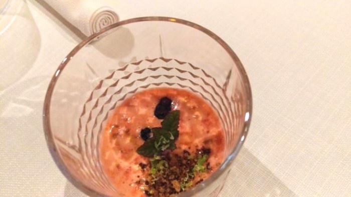 Prima del momento finale un rinfrescante pre-dessert, spumone alle fragole con crumble di nocciole e cioccolato che ripulisce il palato preparandolo al momento finale.