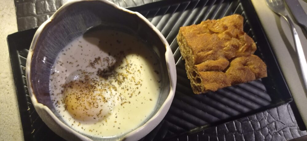 Scarpetta Invernale. Uovo poché, fonduta di parmigiano reggiano 24 mesi, tartufo nero, trancio di focaccia di orzo e riso integrale. Perfetto per fare la scarpetta. Impasto prefermentato con biga all’80% ed idratazione all’85%. Prezzo 10,00 euro.