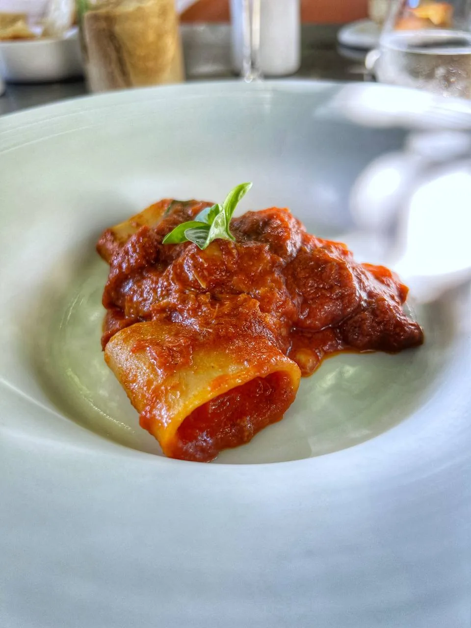 Tra i primi abbiamo assaggiato il Risotto al pomodoro con fondo di pomodoro, polvere e ketchup di datterini e caviale; Tubetto ragù di lumache, spuma di friggitelli e polvere di limone bruciato; un assaggio di paccheri al Ragù estivo.