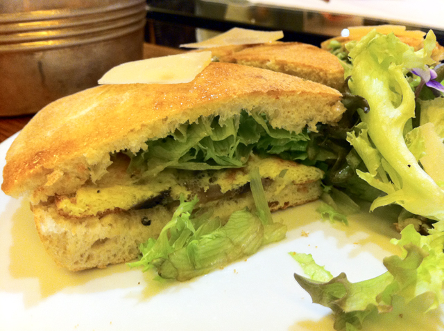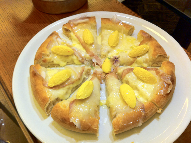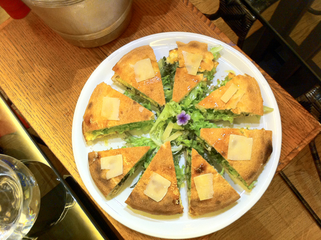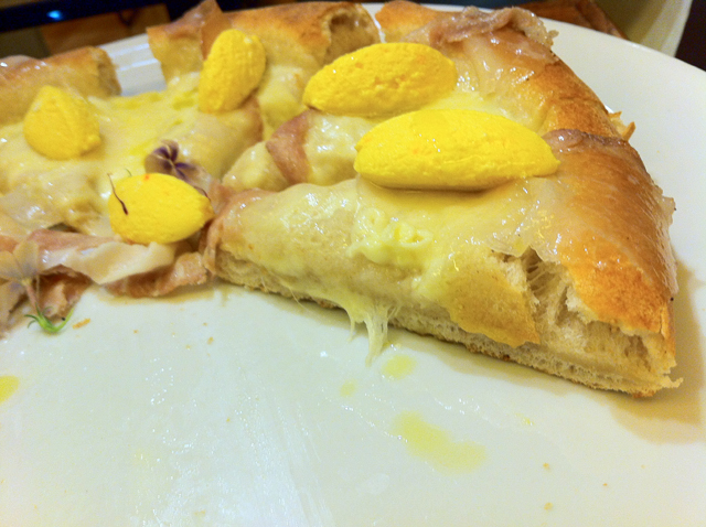 A meno che non si scelga la Margherita (agli integralisti rispondo: certo che è con il basilico!), le altre sono così particolari che sono consigliate in degustazione e calde, perciò vengono servite una alla volta, già tagliate a spicchi, e battezzate con i nomi delle vie del centro storico che mano a mano riaprono al traffico. Noi abbiamo assaggiato l’Aquilana, dedicata a via San Bernardino e realizzata con i consigli di Niko Romito, con mozzarella, zafferano dell’Aquila, ricotta e lardo; e la Casalinga, dal profumo di campagna genuino e morbido, farcita con insalatina, parmigiano reggiano in scaglie e frittata con scamorza affumicata, prezzemolo e funghi, dedicata a suo padre Umberto, l’ex cuoco di bordo che le ha insegnato la cucina gentile.