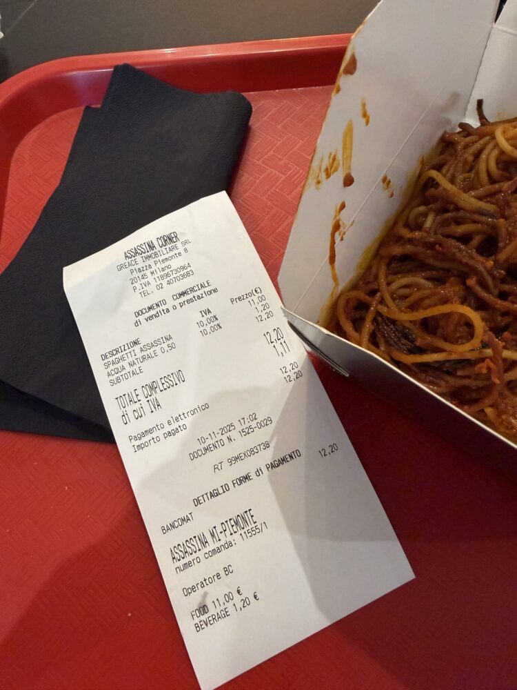 Fa quasi strano pensare che un piatto così generoso possa costare meno di quanto mi sia capitato di pagare in alcuni locali pugliesi. Undici euro per l’Assassina, un euro e venti per una bottiglietta d’acqua, in un posto aperto tutti i giorni dalle 12 a mezzanotte. A Milano, oggi, non è affatto scontato.