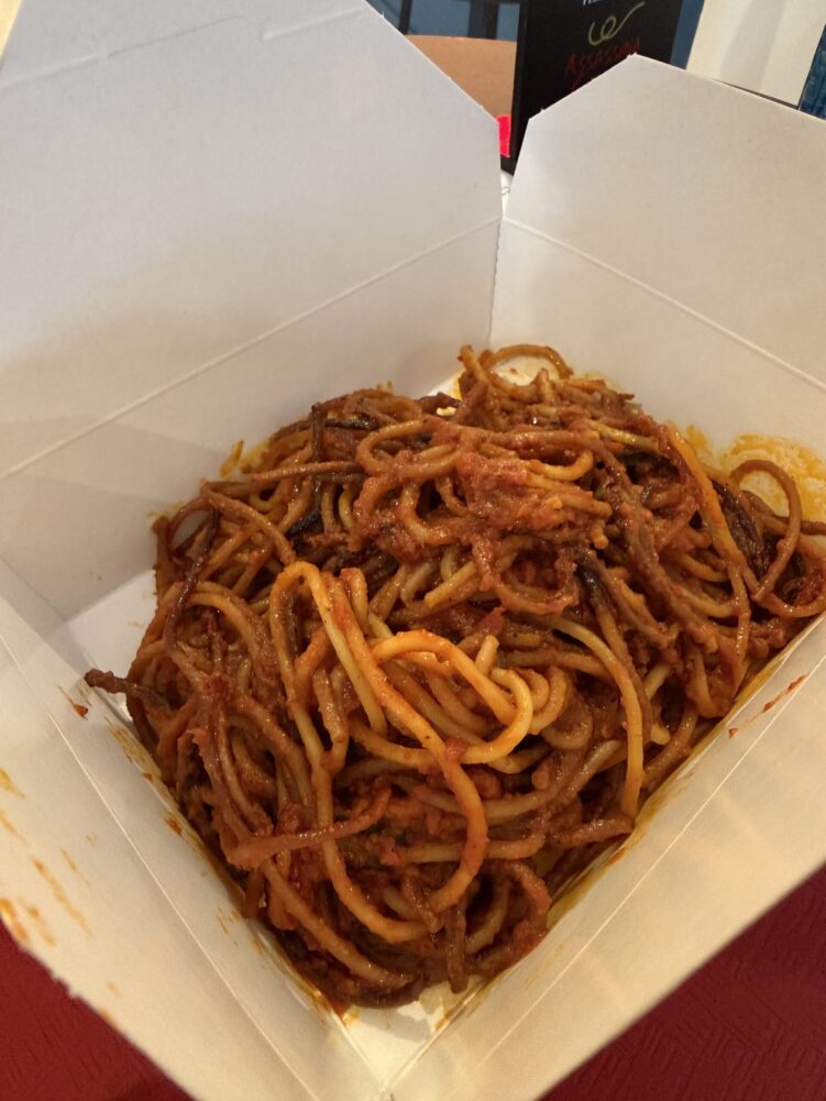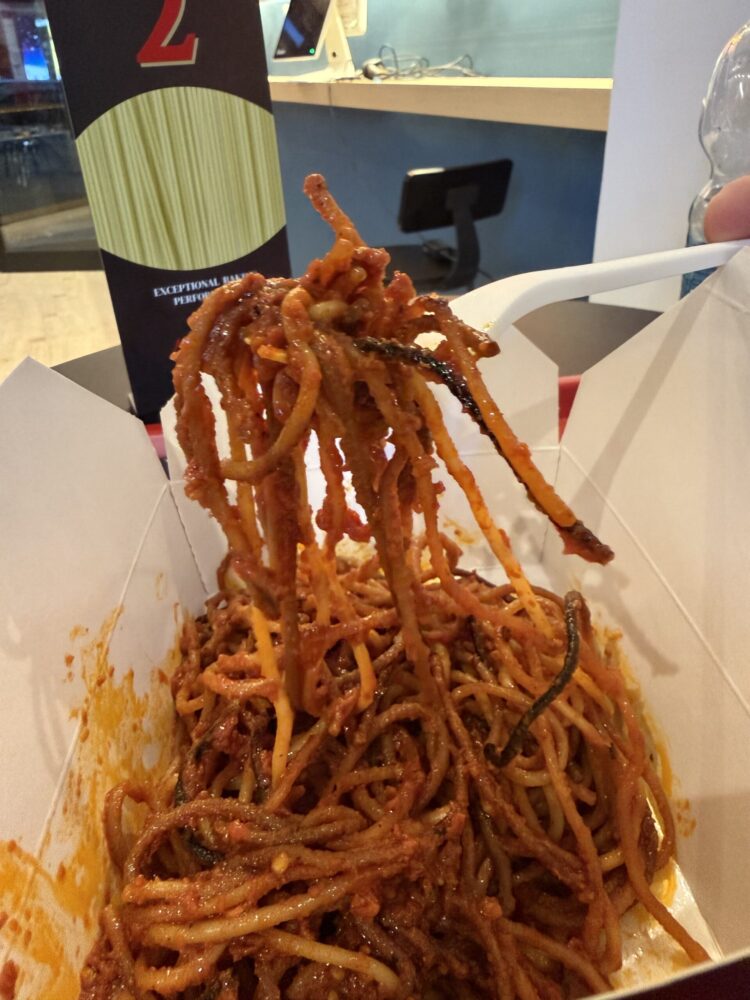 A questo punto ordino lo spaghetto all’assassina. Arriva servito in un contenitore brandizzato che non fa perdere di vista l’esperienza, anche nella forma. Bruciacchiato al punto giusto, piccante equilibrato, intenso ma mai eccessivo, in una parola sola viene da dire sincero. E soprattutto una porzione che sa di Puglia, di quelle dove una manciata in più, a sentimento, non manca mai.