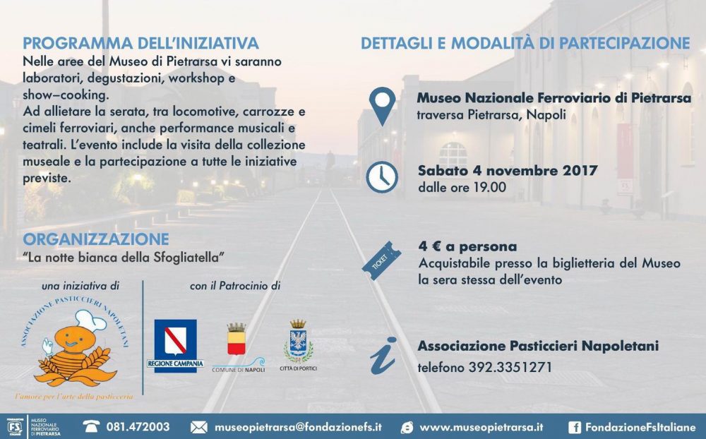 Sabato 4 novembre, dalle ore 19.00 fino alle 24, si terrà “La notte bianca della sfogliatella”, manifestazione dolciaria e artistica organizzata dall’APN – Associazione Pasticcieri Napoletani – in collaborazione con Fondazione FS Italiane, presso il Museo Nazionale Ferroviario di Pietrarsa.
