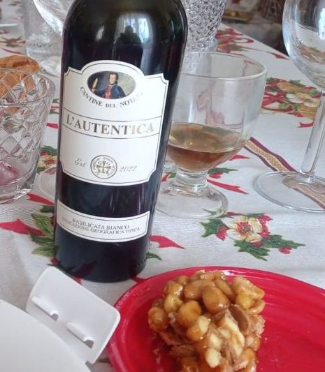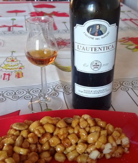 Tra queste ha brillato sicuramente una preziosa etichetta di passito a me molto cara: L’Autentica Basilicata Bianco Igt 2022 di Cantine del Notaio. Si tratta di un blend di Moscato al 70% e saldo di Malvasia. Uve fatte appassire prima sulla pianta e poi sui graticci. Affinamento in barriques di rovere francese per circa un anno e poi elevazione in vetro. Tasso alcolico di quattordici gradi. Pezzo finale intorno ai 30,00 euro la bottiglia di 500 ml.
