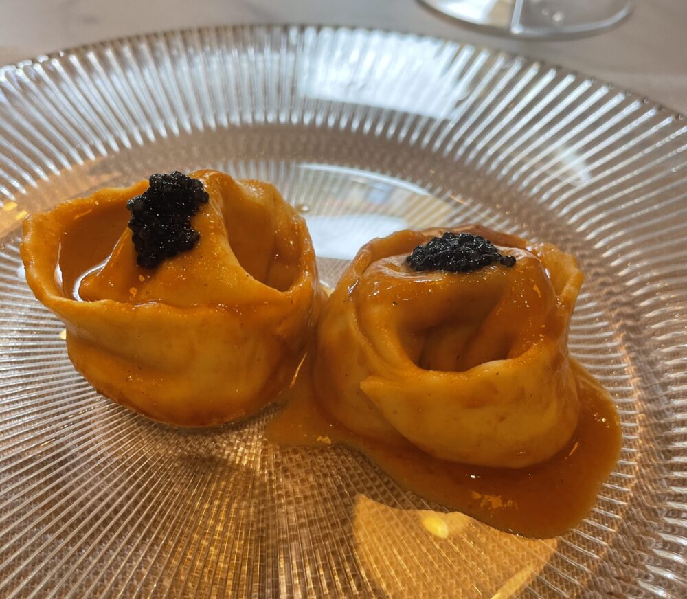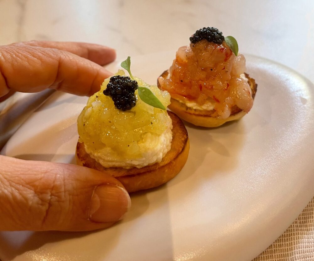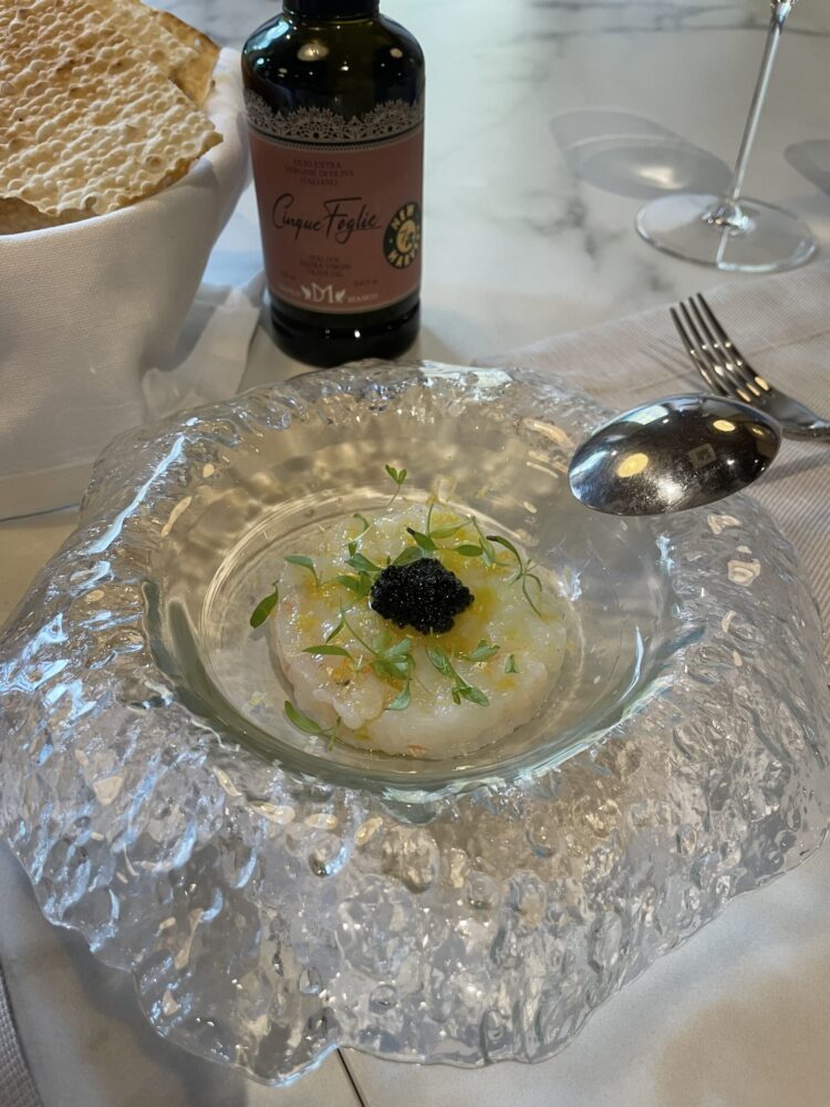 La freschezza del gambero è il punto di forza, nella tartare di gambero si sente quasi lo iodio marino e l’accoppiamento con il caviale che dona maggiore cremosità e sapidità ad ogni boccone è sempre molto ben calibrato dallo chef Luca Unali (tra i proprietari del locale) che ha collaborato con importanti realtà come Soho House e KX Private Menber Club.