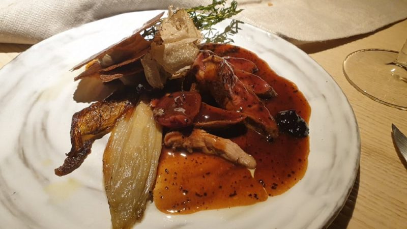 Piccione con spremuta di ciliegie e wafer di fegatini. La prova del nove di tutti i grandi cuochi: il piccione. Una prova del nove, scusatemi il gioco di parole, da 10 e lode. Il primo servizio senza la coscia, servita in un secondo moneto accompagnata dal tartufo. Godurioso fino a dire basta.