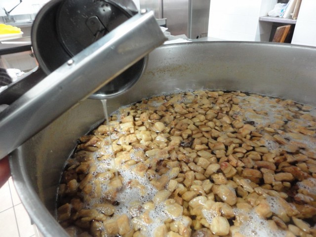 Con uno schiacciapatate, provate a stringerli e se da questa operazione le parti solide escono compatte in un unico pezzo circolare, la sugna e le cigole sono pronte, altrimenti riprovare, sempre rimestando, fino a che non si verifichi questa condizione.
