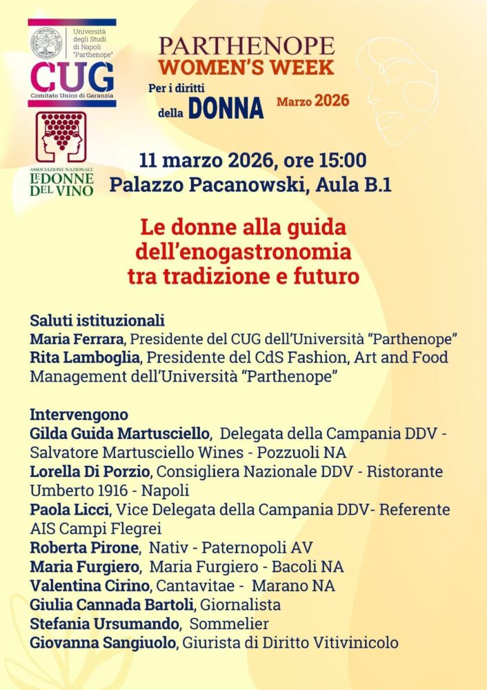 Presso l’Università degli Studi di Napoli Parthenope, nell’ambito della Parthenope Women’s Week 2026, si è svolto l’incontro dedicato al ruolo delle donne nel mondo dell’enogastronomia, con la partecipazione delle socie dell’Associazione Nazionale Le Donne del Vino e degli studenti del corso di Imprese Turistiche e Fashion, Art and Food Management.