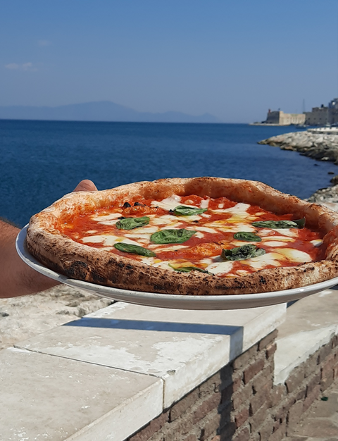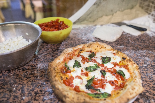 La Margherita: pomodoro San Marzano Dop, fior di latte di Vico Equense, olio extravergine d’oliva, mix di Parmigiano Reggiano Dop e pecorino romano Dop e basilico.