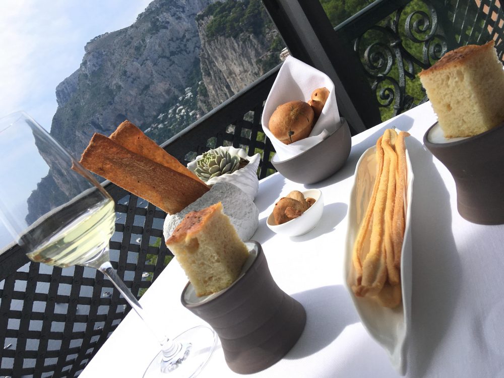 Rimanendo ancorata ad un settore designato, quello del Mediterraneo, di rigore è costruita con dovizia da Luigi Lionetti per stupire nella sua semplicità. Un servizio di sala altamente professionale, una location suggestiva ed una squadra di cucina motivata sono i fattori di un’equazione indovinata. Clientela internazionale, come di costume, tanti ospiti di stanza in rimangono per cena, a preferire il credo di Luigi alle costruzioni artefatte dei soliti nomi capresi. La Ligne de Table ed il decoro di sala sono strutturati in modo da ricordare sia di giorno che di sera, i colori della vetreria costiera e del mare di Capri. Appetizers dalla cucina, sequenza di piccole entrée in ingresso. Un Mediterraneo da scoprire in cui il mare si fonde a componenti acide e vegetali, compenetrato da erbe e tecniche di cottura. Astice, Anguria & Mango. La Palamita scottata con fagiolino ed il lampone. Il Polpo & la sua chips con l’estratto di mela verde. Passando doverosamente per un Bun di Maialino casertano cotto a bassa temperatura e scarola maritata alla napoletana e per un pacchero ripieno di Parmigiana. Concentrazioni pure di sapore.