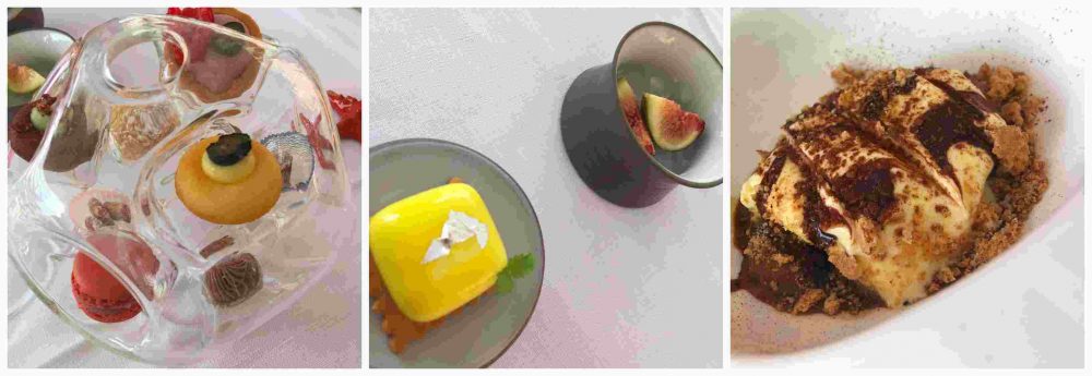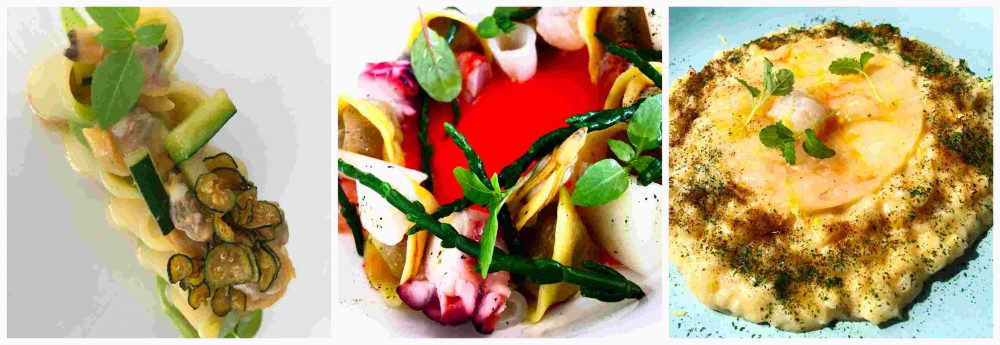Bon Bon di Gambero Rosso, Zuppetta di Olive Nocellara all’acqua di pomodoro, brunoise di olive verdi, mandorle e limone candito. Tagliatella di seppia cotto a bassa temperatura su panzanella di pomodoro datterino. Stile inconfondibile che trae spunti dalla Torre Del Saracino per contestualizzarli a Capri. La profondità e l’equilibrio di questi due antipasti stupiscono. Multi livello. Giocati per essere degustati in singoli bocconi completi. Estetica precisa e vegetalità verticale. La panzanella di pomodoro giallo a cubetti, il suo essere citrico e la dolcezza del cipollotto nocerino ricordano quasi un ricordo candito cedrino. La Tartare di Branzino su Gazpacho di Pomodoro è un vero must. Una luce inaspettata per sapore e curiosità quella dei primi. Magistrale il risotto. Evocativo il Terra e Mare della pasta con Zucchine e Vongole. Invidiabile come piatto il tortello ripieno di ristretto di polpo con crudo e cotto di mare. Ad essere sinceri…una lodevole interpretazione dell’insalata di mare in altra forma e sostanza.