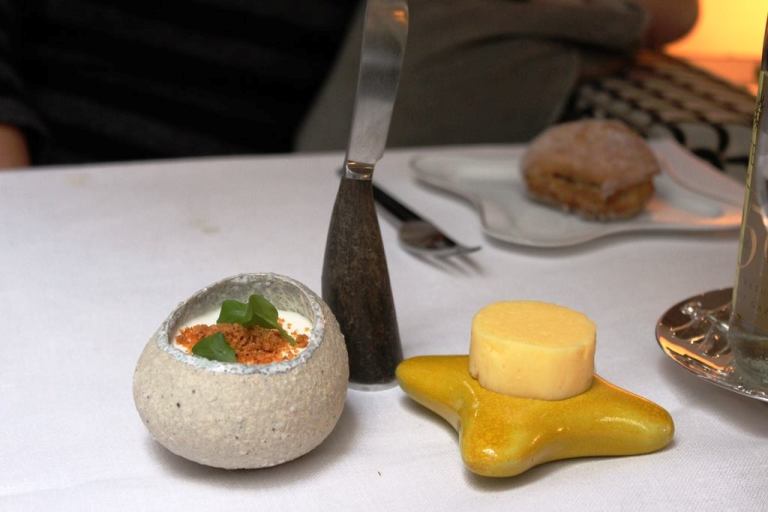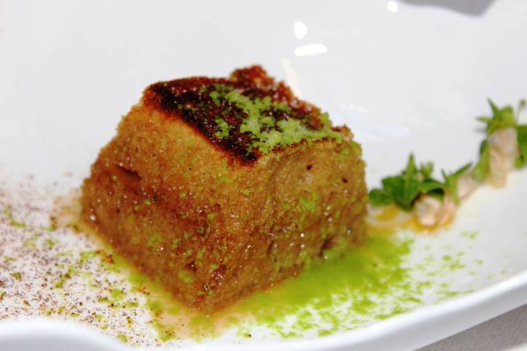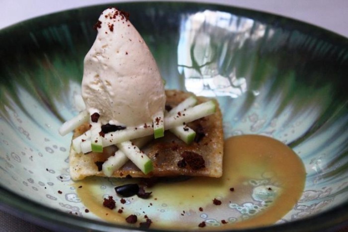 Il branzino selvaggio, straordinaria la materia prima alta tre dita, cotto a bassa temperatura e scioglievole all’assaggio è accompagnato da un estratto di polpa di melanzane (una purea da cui viene eliminata tutta l’acqua), da delle patate croccanti e da un fondo di coriandolo, e fiori d’aglio. Un piatto estremante complesso, molto buono, Il pesce resta sempre il protagonista del piatto, e i condimenti servono per esaltarne il gusto. Perfezione.