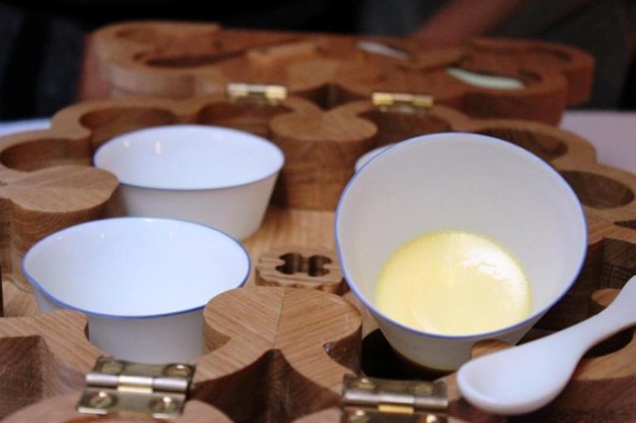 Un brodo di cocco, aringhe, cipolle secche, curry, lime e gamberetti. Altra citazione colta, altro omaggio, questa volta a Lucien Tendret, e alla ricetta inserita nel libro “la Table au pays” di Anthelme Brillat-Savarin. Ricetta classicissima ma con divagazioni asiatiche, che però tiene intatto tutto il sapore del piatto tradizionale, alleggerito e allungato del gusto. Neo classicismo