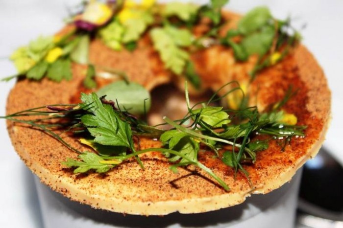 Una focaccia molto soffice e porosa, quasi eterea, imbevuta in un succo di funghi porcini, completato da una granita di prezzemolo, per un risultato sorprendente come mangiare un concentrato di fungo porcino, elegante e senza alcuna pesantezza. Concentrazione di sapori.