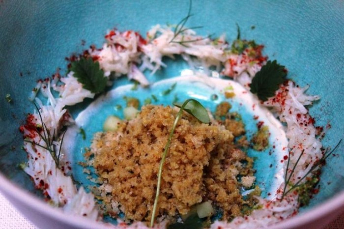 Un granchio sfilacciato, una granita di camomilla arance e soia, delle briciole di pane croccante dei pezzetti di cetriolo. Temperature e consistenze diverse, inizio su note di freschezza e acidità. L’inizio perfetto.