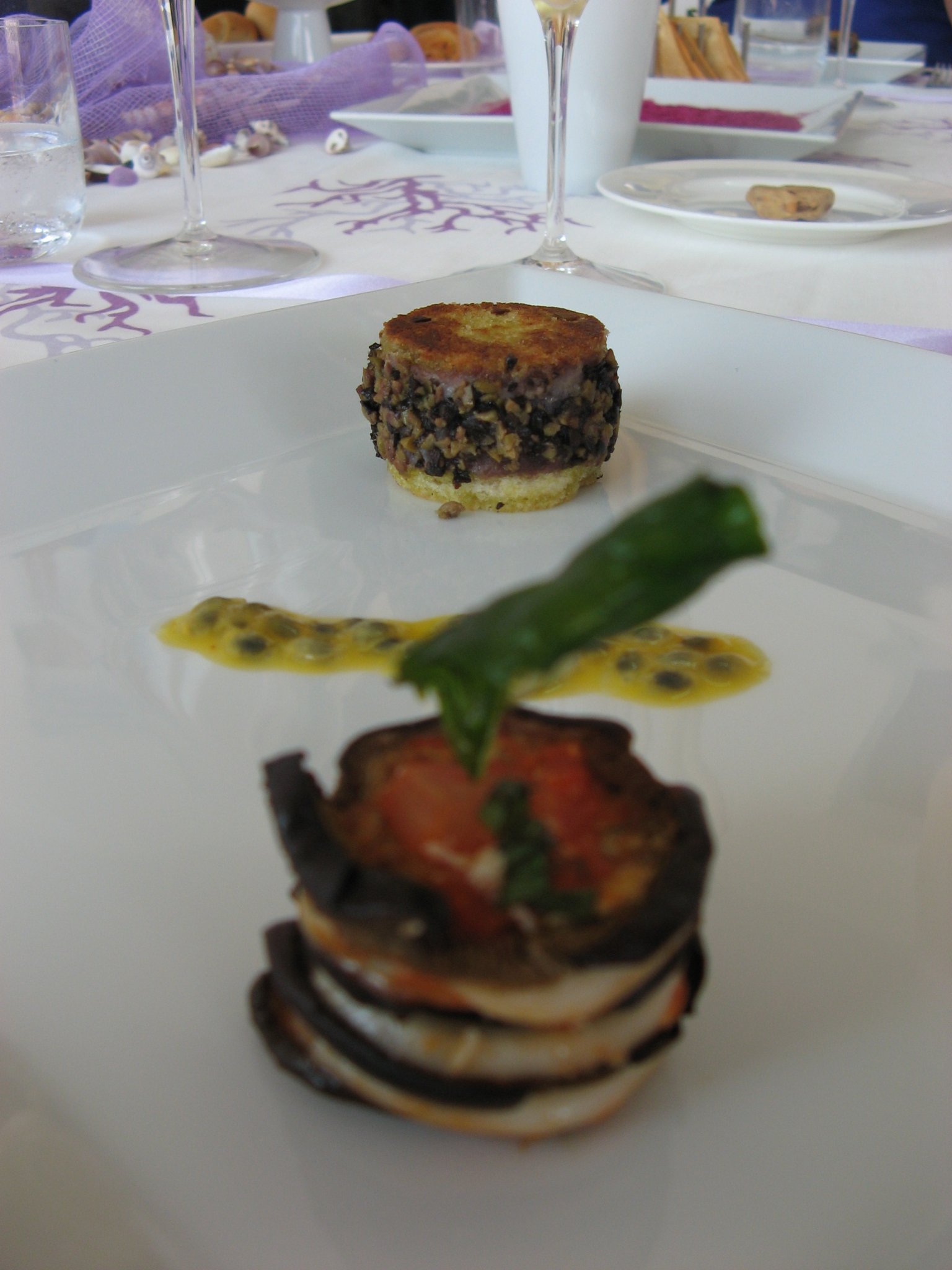 Tagliare le fette di pane con il coppa pasta rotondo, lasciarle a parte. Tritare il tonno e condirlo con sale, pepe, prezzemolo e olio. Tritare le olive verdi e nere. Disporre nel piatto la base di pancarré e adagiare la tartara di tonno e chiudere con il pancarré. Infine in granellare nel trito d’olive. Per la parmigiana: Tagliare le melanzane a rondelle, disporle in teglia, condirle con sale ed olio, cuocerlo in forno a 170° C. Tagliare la scamorza a rondelle, tagliare il basilico a julienne e grattugiare il Cacio Reale. Disporre la fetta di melanzana nel coppa pasta, ricoprirla con salsa di pomodoro, basilico, scamorza e cacio. Ricoprire con un’altra melanzana e ripetere il procedimento per altre due volte. Completare il piatto con la polpa del frutto della passione.