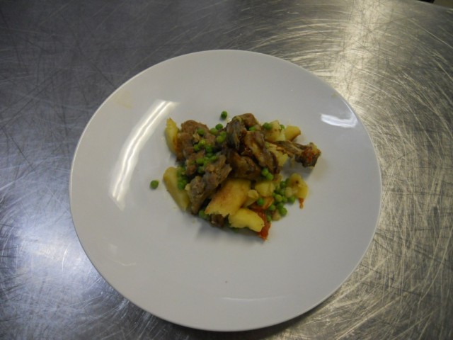 Prendere un ruoto far rosolare olio e cipolla tagliata a julienne, mettere i pezzi di agnello e lasciar rosolare per qualche minuto, bagnare con il vino bianco aggiungere i pomodorini tagliati a metà, le patate tagliate precedentemente, i piselli sbollentati e un paio di mestoli di brodo e cuocere in forno per circa 30 min. a 180°.una volto cotto prendere le uova e sbatterle e farle amalgamare al tutto e servire.