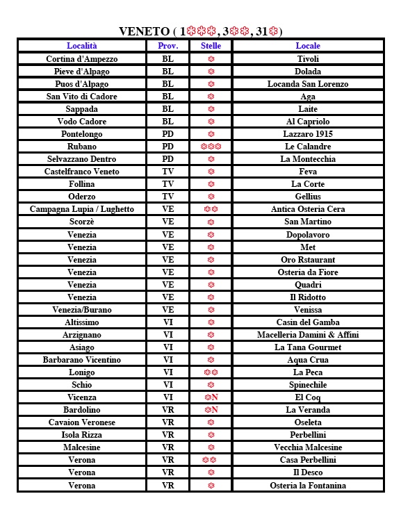 In Veneto, per la Michelin 2017, la conferma delle 3 stelle per Le Calandre dei fratelli Alaimo e i tre ristoranti a due stelle, e 2 novità – El Coq a Vicenza e La Veranda a Bardolino) tra i 31 ristoranti con una stella. Due le novità, la stella a Vincenza per Lorenzo Cogo e quella a Bardolino de La Veranda dove però lo chef ha già lasciato.