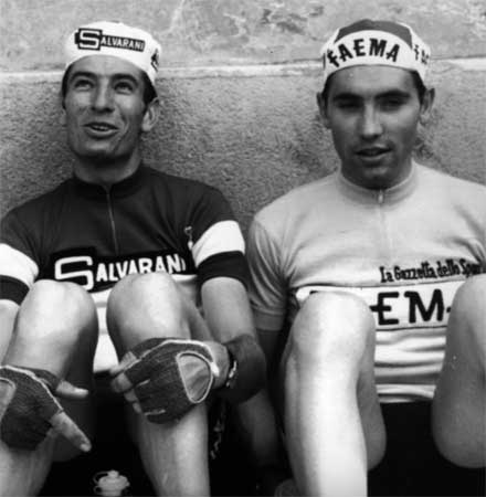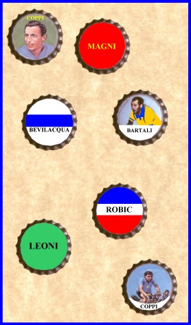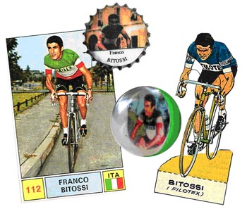 Corridori e colori persi nel tempo, le date si confondono: non saprei dire se li rammento più per le loro imprese o perchè immortalati sui tappini intorno alla metà degli anni sessanta. Altig con il tappino iridato da campione del mondo, il belga Van Looy, lo spezzino, eroico, Graziano Battistini, De Filippis, Adorni, Balmamion, il gregario Imerio Massignan, maglia verde-nero, di quelle di lana, con la scritta Legnano. La televisione in bianco e nero non mandava nemmeno Carosello, se Maspes piazzava un surplace, eterno, sui legni del Vigorelli. Poi venne Merckx, il cannibale, e si mangiò tappini e infanzia.