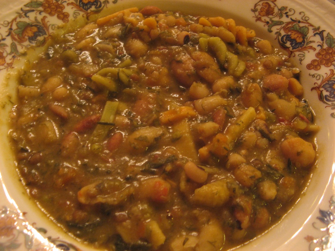 Unire le diverse qualità di legumi cotti, le verdure ripassate in padella, i profumi e le spezie lessate con il brodo, le polpettine, i carciofini e le zucchine fritte, il sugo.