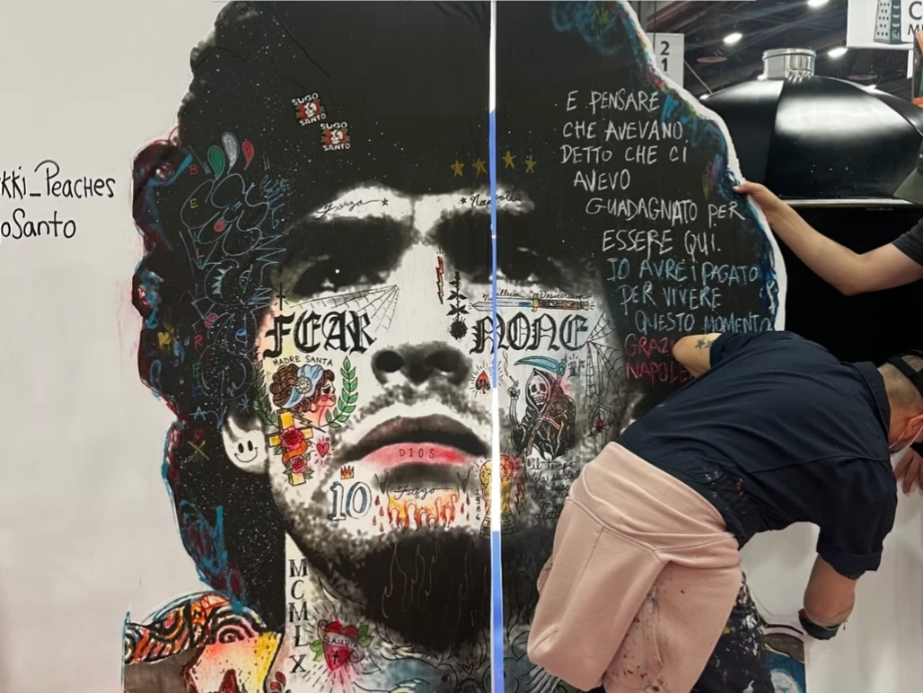 A sancire il legame indissolubile tra la cultura pop internazionale e le radici partenopee, la partecipazione di AVPN si è arricchito di un vero e proprio “evento nell’evento”. Durante la seconda giornata del Pizza Expo (25 marzo), il celebre street artist italo-canadese Stikki Peaches – noto a livello mondiale per i suoi mash-up visivi che fondono cultura pop, moda e riferimenti urbani – ha realizzato un’esclusiva live performance all’interno della fiera. Sotto gli occhi del pubblico internazionale, l’artista ha dato vita a un’opera d’arte inedita dedicata all’icona immortale della città di Napoli: il celebre campione argentino Diego Armando Maradona. Un omaggio unico capace di unire la creatività vibrante dell’arte urbana al calore della vera pizza napoletana.