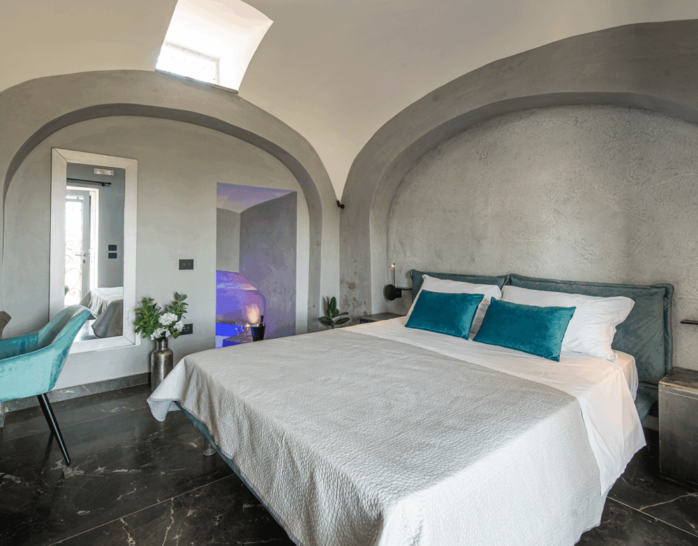 La suite “La Pergola”, con la sua vasca idromassaggio interna e la vista sul golfo, è una poesia sospesa tra cielo e terra.