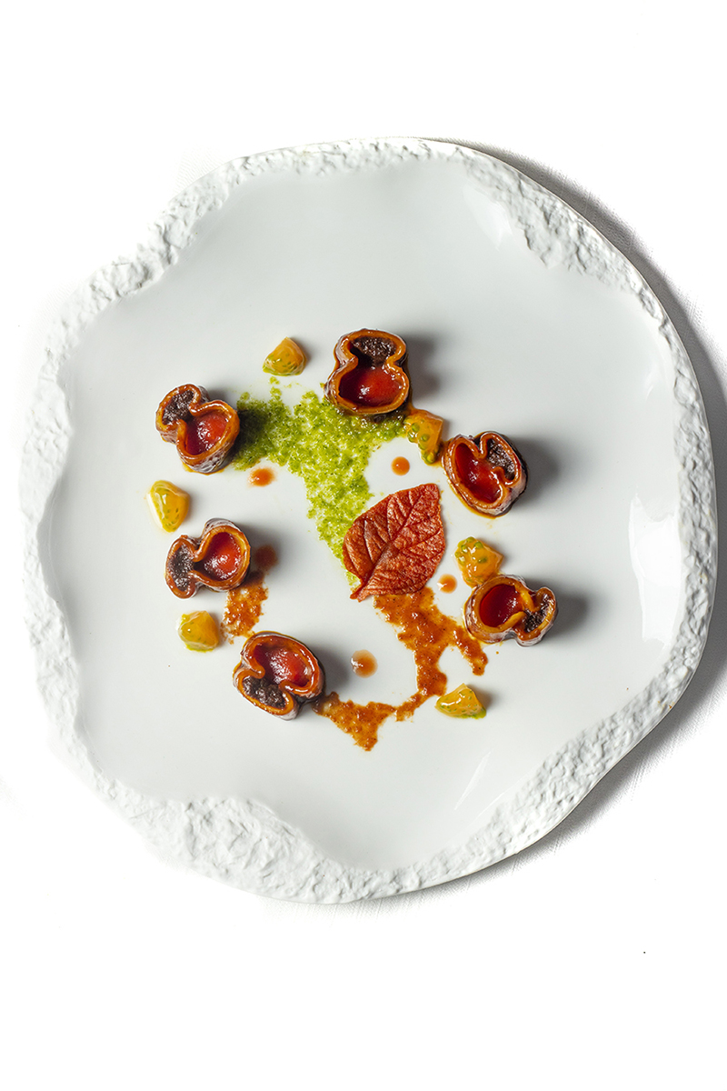 Realizzare sul piatto “lo Stivale” con la base verde e con il pomodoro alla brace. Posizionare i Campotti ripieni nel piatto. Alternare i semi verdi e le gocce di pomodoro fermentato tra un Campotto e l’altro ed infine terminare con un filo di olio di pomodoro, una grattugiata di pomodoro umami e la foglia di pomodoro.